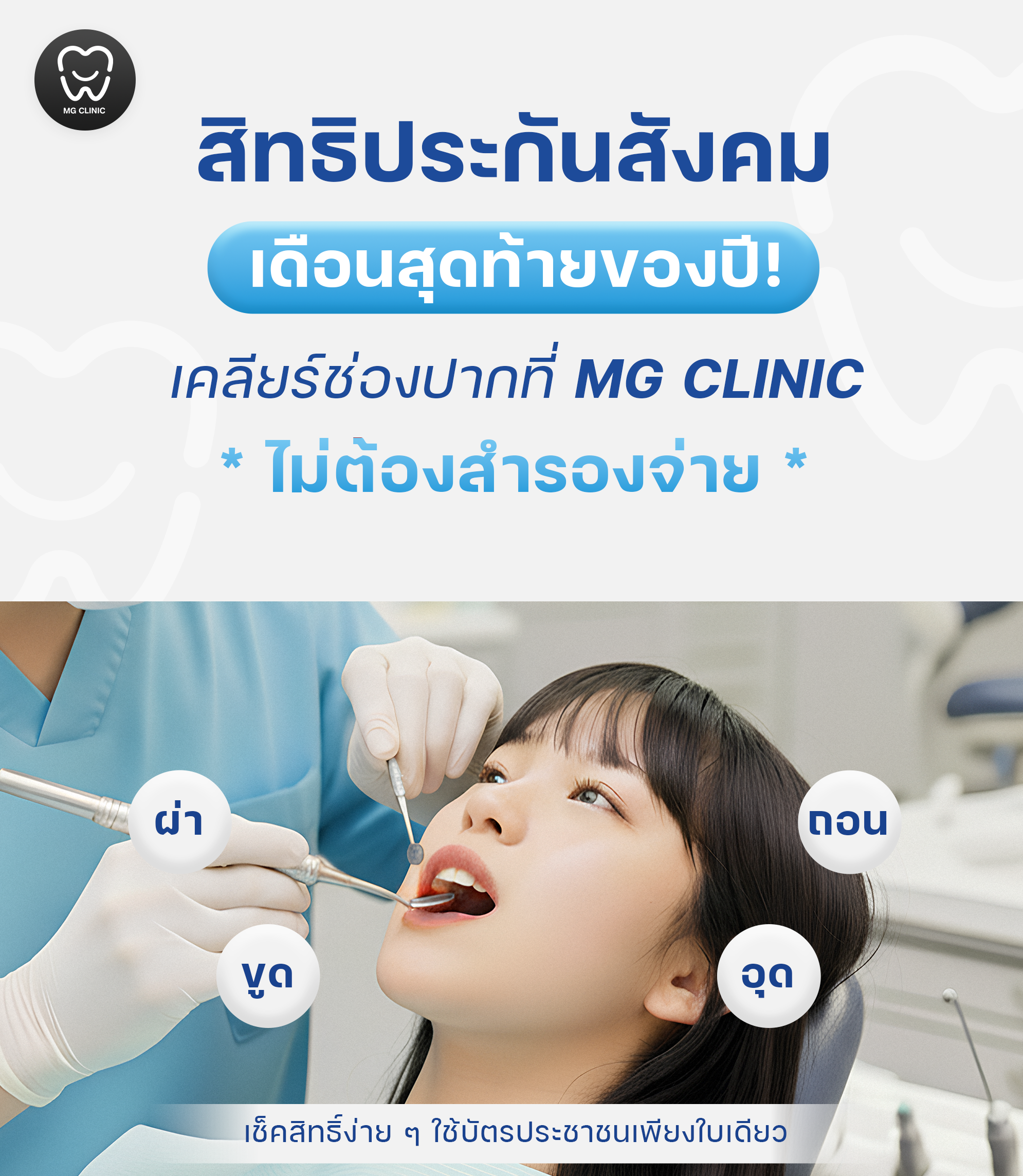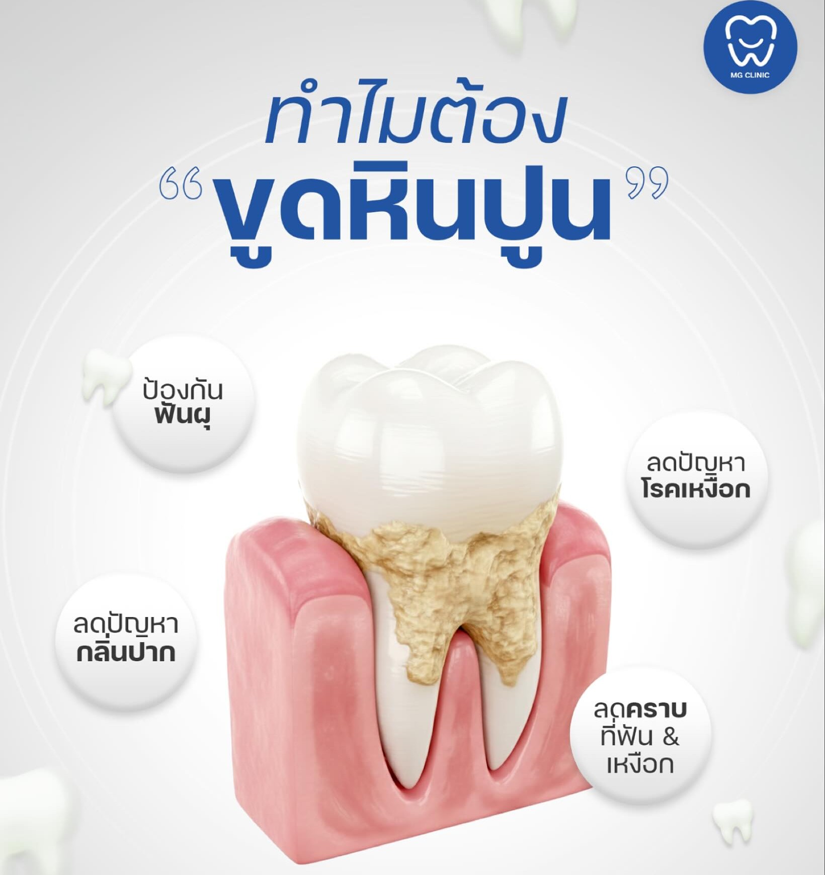 ราคาสำหรับการขูดหินปูนขึ้นอยู่กับทันตแพทย์ประเมิน สามารถใช้ประกันสังคมจ่ายค่ารักษาได้ เข้ามาปรึกษาได้ที่ MG  Clinic โดยทันตแพทย์ผู้เชี่ยวชาญ