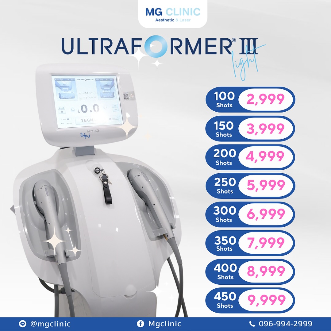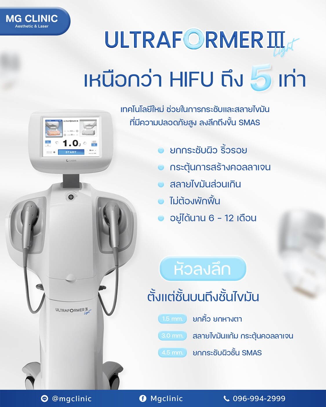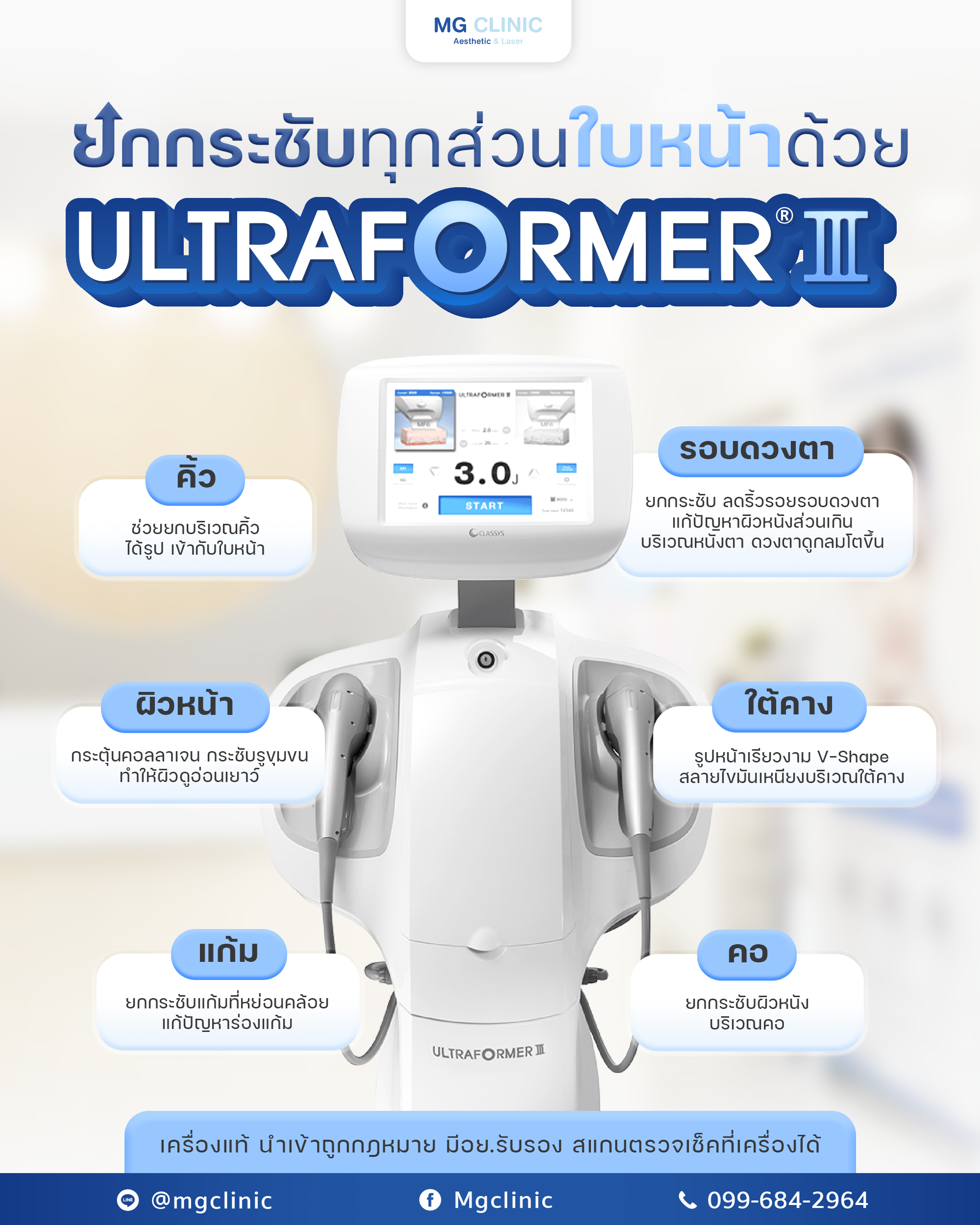 Ultraformer III คือ นวัตกรรมคลื่นอัลตราซาวด์ความเข้มข้นสูง (High Intensity Focused Ultrasound: HIFU) ที่ส่งคลื่นความร้อนลงไปยังผิวหนังชั้น SMAS ช่วยกระตุ้นคอลาเจนและการจัดเรียงเส้นใยใต้ผิวหนังให้แข็งแรง ทำให้ผิวกระชับพร้อมทั้งสลายไขมัน ปรับรูปหน้าให้ดูเล็กเรียว ลดริ้วรอย ลดเหนียง และแก้มย้อย โดยไม่ต้องผ่าตัด ไม่ต้องพักฟื้น เห็นผลลัพธ์หลังทำทันที และอยู่ได้นาน 6-12 เดือน
