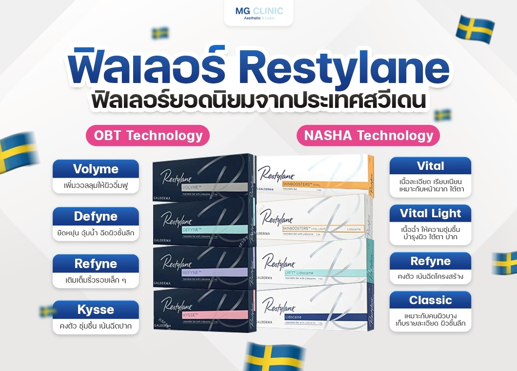 เป็นฟิลเลอร์จากประเทศสวีเดน ผลิตโดยบริษัท Galderma ด้วยเทคโนโลยี NASHA ซึ่งช่วยให้เนื้อฟิลเลอร์มีความคงตัวสูง ให้ผลลัพธ์ที่อยู่ได้นาน และยังมีการพัฒนาเทคโนโลยี OBT Technology ในบางรุ่น เพื่อเพิ่มความยืดหยุ่นและความนุ่มของเนื้อฟิลเลอร์ รุ่นยอดนิยม เช่น Restylane Classic, Restylane Lyft, Restylane Volyme, Restylane Kysse